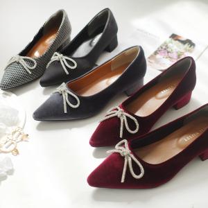 ラインストーンリボン ポインテッドトゥパンプス バレエパンプス レディース 痛くない かかとクッション アミアミ