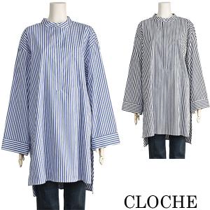 CLOCHE ストライプ シャツ ロング レディース プルオーバー 長袖 ブルー グレー 40代 50代
