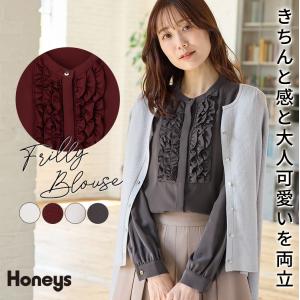 トップス ブラウス 長袖 オフィス きれいめ 胸元フリル フリル バンドカラー フロントボタン 比翼仕立て レディース Honeys ハニーズ 胸元フリルブラウス
