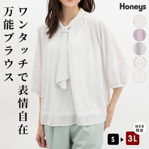 トップス ブラウス 大きいサイズ オフィス きれいめ ボウタイ アクセサリー付き ジョーゼット 無地 レディース Honeys ハニーズ 6分袖アクセ付ボウタイブラウス