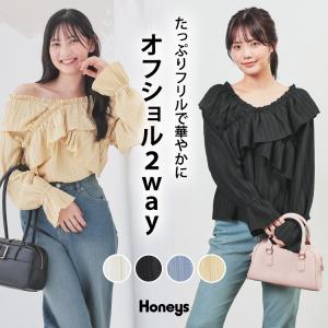 トップス カットソー 長袖 オフショルダー 2way ストレッチ ジャカード フリル キャンディスリーブ レディース Honeys ハニーズ オフショル2way