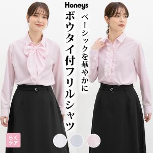 トップス シャツ ブラウス 長袖 大きいサイズ らくらくアイロン ボウタイ スキッパー フリル レディース Honeys ハニーズ ボウタイ付フリルシャツ