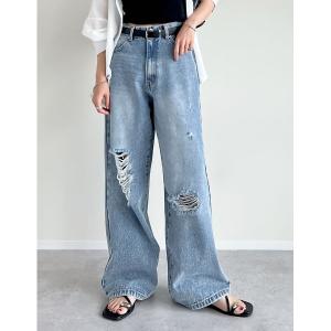 ジーンズ デニム デニムパンツ 「低身長/高身長サイズ有」ワイドストレートアシンメトリーダメージデニムパンツ レディース