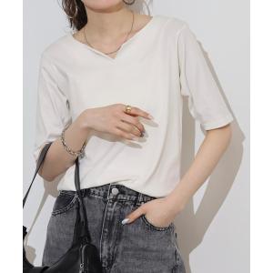 tシャツ キーネックコットン5分袖トップス レディース