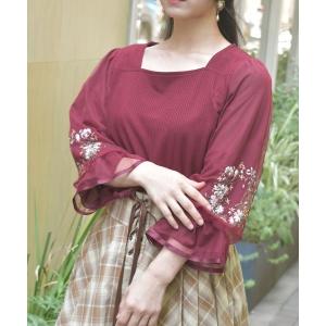 tシャツ コスモス刺繍ボリューム袖プルオーバー レディース