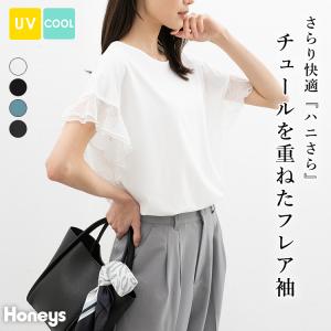 トップス カットソー 半袖 ハニさら 大きいサイズ UVカット 接触冷感 フレア袖 SALE Honeys ハニーズ 袖チュールトップス