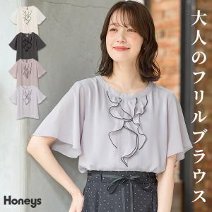 トップス ブラウス 半袖 オフィス きれいめ フリルブラウス 配色 メロー フリル フレア袖 レディース SALE Honeys ハニーズ 配色メローフリルブラウス