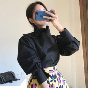 ブラウス 長袖 おしゃれ 冬 春 スタンドカラーボリューム袖 ホワイト ベージュ ブルー ブラック 白 黒 M L