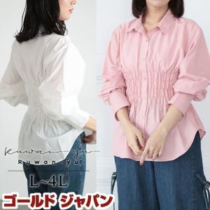 大きいサイズ レディース トップス シャツ シャーリング くびれ 長袖 ボタン 無地 きれいめ 冬コーデ 春 秋 L LL 2L 3L 4L オフホワイト ピンク ルワンユー