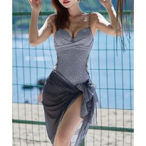 水着 レディース水着 くびれカットアウトクロスラメモノキニ+シアーパレオ 2点セット レディース