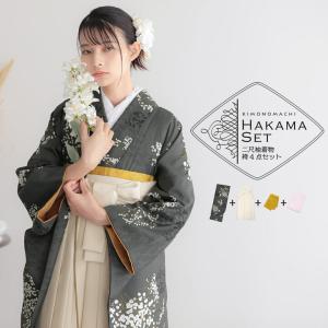 袴 セット 卒業式 女性 4点セット「二尺袖:かすみ草に青海波 墨色+袴:オフホワイト 葡萄+袴下帯:イエローオーカー 麻の葉+襦袢」卒業式 (メール便不可)