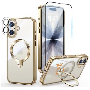 互換品 iPhone17 用 ケース フィルムセット Magsafe対応 360°回転スタンド付 ガラスフィルム/カメラ保護フィルム付 3点セット 耐衝撃 ゴールド