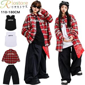 キッズダンス 演出服 HIPHOP 舞台服 格子柄 シャツ 長袖 赤 キッズ ダンス 衣装 練習着 ヒップホップ ダンス衣装 キッズ 女の子 男の子 黒 白 ベスト 子供服 上
