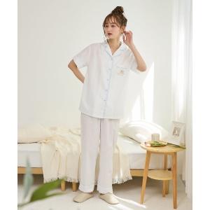 パジャマ ルームウェア 綿100%バスタイムくま刺繍前開きサッカー半袖パジャマ レディース