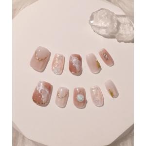 ネイルチップ ネイルシール 水光ネイルピンクマーブルフラワーアートストーンラメオーバルネイルチップ 冬ネイル(15)