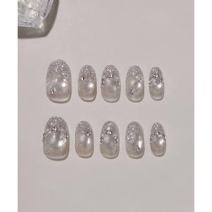 ネイルチップ ネイルシール 3D水光ネイルホワイトマグネットシルバーラメフレンチストーンパールオーバルネイルチップ