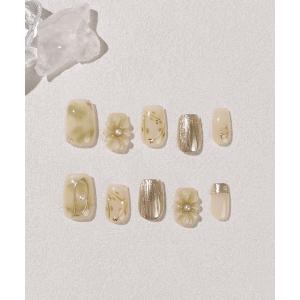 ネイルチップ ネイルシール 3D水光ネイルグリーンニュアンス3Dフラワーゴールドミラーショートスクエアネイルチップ