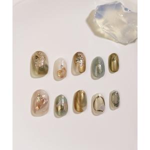 ネイルチップ ネイルシール 水光ネイルカーキゴールドホイルニュアンスショートオーバルネイルチップ