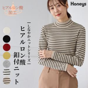 トップス ニット セーター 長袖 しなやかニット ヒアルロン酸加工 ハイネック リブ 無地 ボーダー柄 レディース Honeys ハニーズ ヒアルロン酸釦付ニット