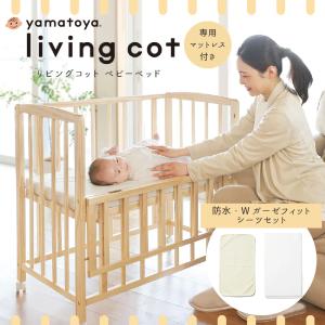 大和屋 ベビーベッド リビングコット 敷きマットレス付 防水シーツ・フィットシーツ セット 高さ調節 キャスター付き コンパクト 木製 軽量 リリト後継