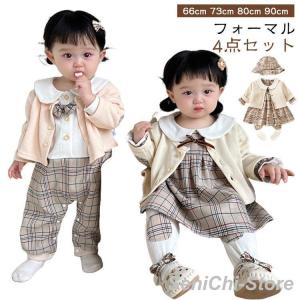ベビー服 フォーマル 4点セット 長袖 綿 女の子 男の子 キッズ 子供 ベビーロンパース ワンピース 赤ちゃん チェック柄 蝶ネクタイ 姉妹 兄弟