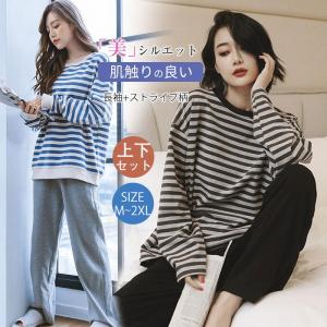 パジャマ ルームウェア レディース 初秋 前開き かわいい ストライプ柄 長袖 寝巻き 部屋着 ゆったり おしゃれ ナイトウエア 上下セット 韓国風