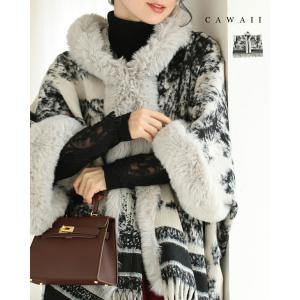 Sから3L対応 混ざり合う無彩色のリュクスなファー付きポンチョ