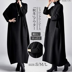 黒ラシャロングワンピース厚手ハイネックロングワンピースラシャ立ち襟ワンピースハーフジップゆったり暖かいアウター大人長袖ママ服ワンピース卒業式入学式秋冬