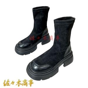 ショートブーツ レディース スエード調 粗いかかと スクエアトゥ 切り替え ミドルヒール 秋 冬 滑り止め 厚底 走れる 安定感 細見え
