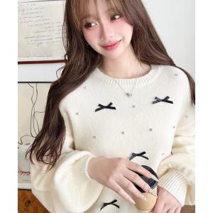 ニット セーター リボンビジューショート丈もちもちニットプルオーバー レディース ニット セーター リボンビジューショート丈もちもちニットプルオーバー レディース2,899円
