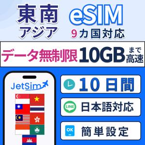 【東南アジア9カ国 eSIM】10日間 10GB 高速データ 1日1GB シンガポール・香港・タイ・インドネシア・マレーシア含む 即日発行 テザリング可