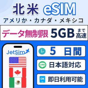 【アメリカ・カナダ・メキシコ eSIM】5日間 5GB 高速データ 1日1GBまで高速 4G/5G対応 即日発行 テザリング可
