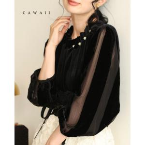 Sから3L対応 黒 パールを飾ったタックネックのベロアプルオーバートップス