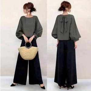 セットアップ レディース 秋服 トップス ブラウス 丸首 長袖 パフスリーブ ショート丈 ボトムズ ワイドパンツ ゴム ハイウエスト 大人 40代50代 上下セット 無地