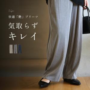 パンツ ボトムス ワイド ロング プリーツ 軽い 細見え ストライプ カジュアル ウエストゴム ポケット 体型カバー
