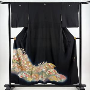 黒留袖 身丈154.5cm 裄丈62cm S 袷 松井青々 落款あり 花車 有職文様 金彩 ぼかし 黒 正絹 秀品 中古