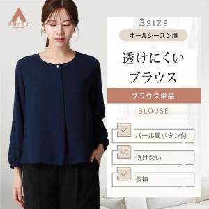 【洋服の青山】ブラウス 長袖 レディース 春夏 秋冬 オールシーズン ネイビー 紺無地 パール釦 プルオーバー クルーネック 透けにくい 洗える ゆったり オフィス