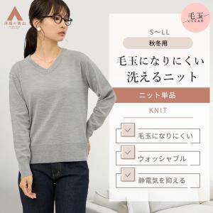 【洋服の青山】洗える 毛玉になりにくい ニット 長袖 レディース 秋冬 Vネック グレー 灰色 無地 ウォッシャブル 静電気防止 セーター オフィス 仕事