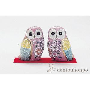 九谷焼 ペア梟 ピンク盛 2.5号 敷物付 ( ふくろう 盛 木札名入れ有料 退職祝い 定年 フクロウ 置物 玄関 風水 小物 セット 九谷焼 結婚 出産 内祝い )