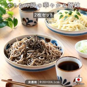 麺鉢 皿 プレート 径20cm 美濃焼 日本製 かりゆし すのこ付 やちむん風 沖縄 伝統柄 大皿 盛皿 2個組 麺皿 ブルー 花柄 700ml 電子レンジOK 食洗機OK 爆買