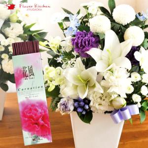 お供え 花と線香のセット ユリのお供えアレンジMサイズ と 宇野千代のお線香 仏花 お悔やみ お供え物 花 お彼岸 お盆 喪中見舞い 四十九日 一周忌 命日 FKAA