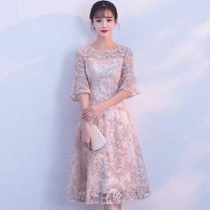 謝恩会 結婚式 発表会 ドレス ピンク 膝丈 膝下 ミモレ丈 コードレース 刺繍 フレア 二の腕カバー 袖あり 韓国 パーティードレス 20代 30代 40代 送料無料