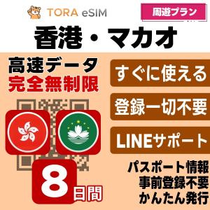 香港 マカオ 周遊 eSIM | 8日間 | 無制限 | 最短15分QRコード自動発行(24時間) | 高速データ SIM 5G/4G 即日発行 テザリング可 日本で事前設定OK LINEサポート