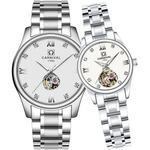 ラグジュアリーラヴァーズ 自動巻き 機械式 ホロウ ルミナス 防水 ダイヤモンド入り ステンレススチール カップルウォッチ (ホワイトシルバー) 並行輸入品