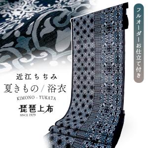 夏きもの 反物 近江ちぢみ 綿麻 シボ 仕立て付き 琵琶上布 ネイビー ダマスク 更紗 フルオーダー 小紋 浴衣 女性 和装