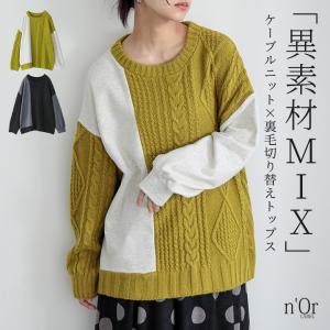 ニット 長袖 レディース トップス セーター 裏毛 スウェット ドッキング 異素材 配色 ケーブル編み クルーネック 「メール便不可」「30」