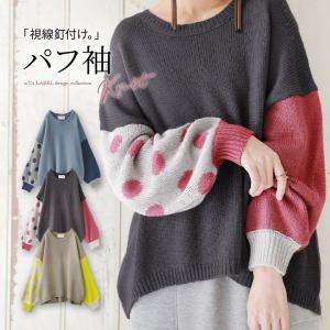 ニット 長袖 レディース トップス セーター シャツ ドッキング レイヤード風 異素材 ぽわん袖 ロングリブ袖 春 秋 冬 返品交換不可 「メール便不可」「20」