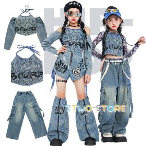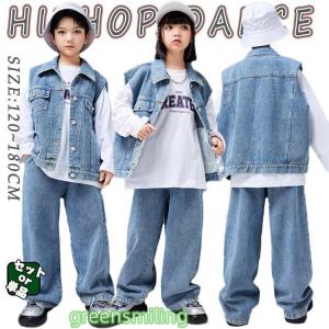 デニムベスト キッズ ダンス衣装 セットアップ 男の子 女の子 派手 かっこいい デニムパンツ ベスト ワイドパンツ Tシャツ ヒップホップ HIPHOP 子供服 ジャズ