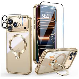 互換品 iPhone17 Pro 用 ケース フィルムセット Magsafe対応 360°回転スタンド付 ガラスフィルム/カメラ保護フィルム付 3点セット 耐衝撃 ゴールド