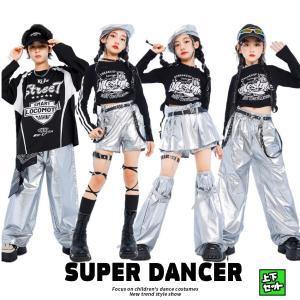 キッズダンス衣装 セットアップ ヒップホップ 男の子 ガールズ へそ出しトップス K-POP 韓国 黒 銀 シルバー メタル 光沢 キラキラ衣装